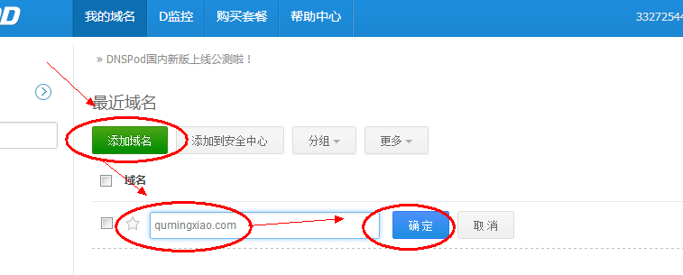 1、首先在在www.dnspod.com注冊個用戶 然后登錄管理后臺, 添加域名-輸入域名-確定