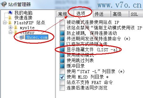 那么我們需要把htacesss隱藏文件顯示出來,假如您用的是flashxfp那么可以按照如圖設置顯示FTP服務器上的隱藏文件,將其修改成別的名稱或者備份后刪除,再打開網站可能已經正常顯示了,如果您又啟用偽靜態,那么這個時候就需要檢查您的htaccess文件的配置了。出現以上文字基本上是.htaccess配置問題。