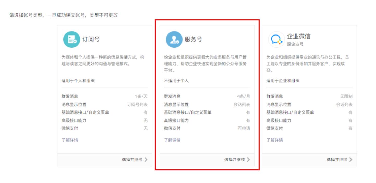 05.再次確定賬號(hào)類型為服務(wù)號(hào),點(diǎn)擊選擇并繼續(xù)。