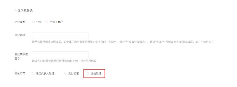 07.選擇對(duì)應(yīng)的企業(yè)類型,按照營(yíng)業(yè)執(zhí)照填入企業(yè)名稱、營(yíng)業(yè)執(zhí)照注冊(cè)號(hào)。認(rèn)證方式推薦選擇微信認(rèn)證,300元的認(rèn)證費(fèi)后面還是需要交了來(lái)微信認(rèn)證。